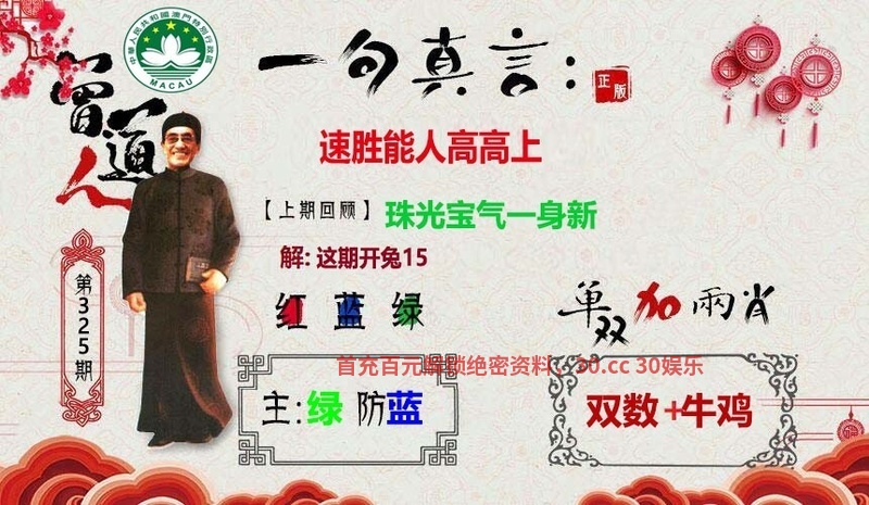 | 【超级王牌解一句真言】325期:速胜能人高高上 【王牌看好波色】绿波+蓝波 【王牌单双两肖】双数+牛鸡 |